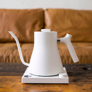 Fellow est une jeune marque américaine qui apporte à nos tables design et élégance. La bouilloire Stagg, possède un indicateur de température avec un marquage rouge lorsque l’eau est entre 90° et 95°. Le débit d’eau est contrôlé grâce à un bec col de cygne fin, permettant d’humidifier uniformément la mouture. La bouilloire Stagg possède également un poids dans son manche, qui se déplace au plus près de votre main et accompagne votre mouvement.