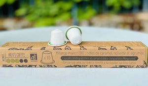 Découvrez nos capsules compatibles Nespresso 100% biodégradables! Composées en grande partie de cellulose végétale, vous pourrez les déposer ensuite dans votre compost ou tout simplement dans la poubelle pour les cartons.