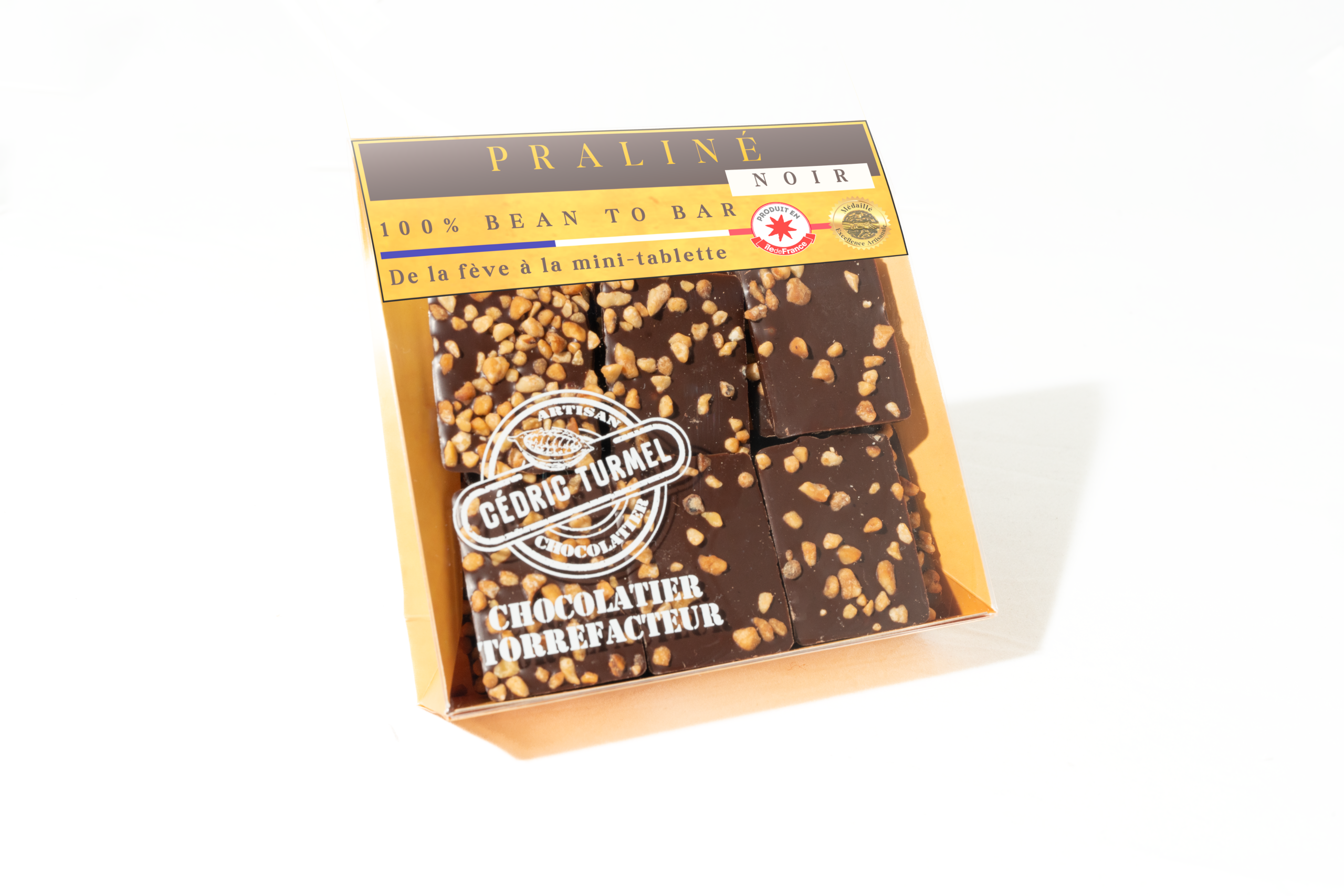 Mini tablettes au chocolat noir (70%) praliné, éclats d'amandes et de noisettes croquantes.