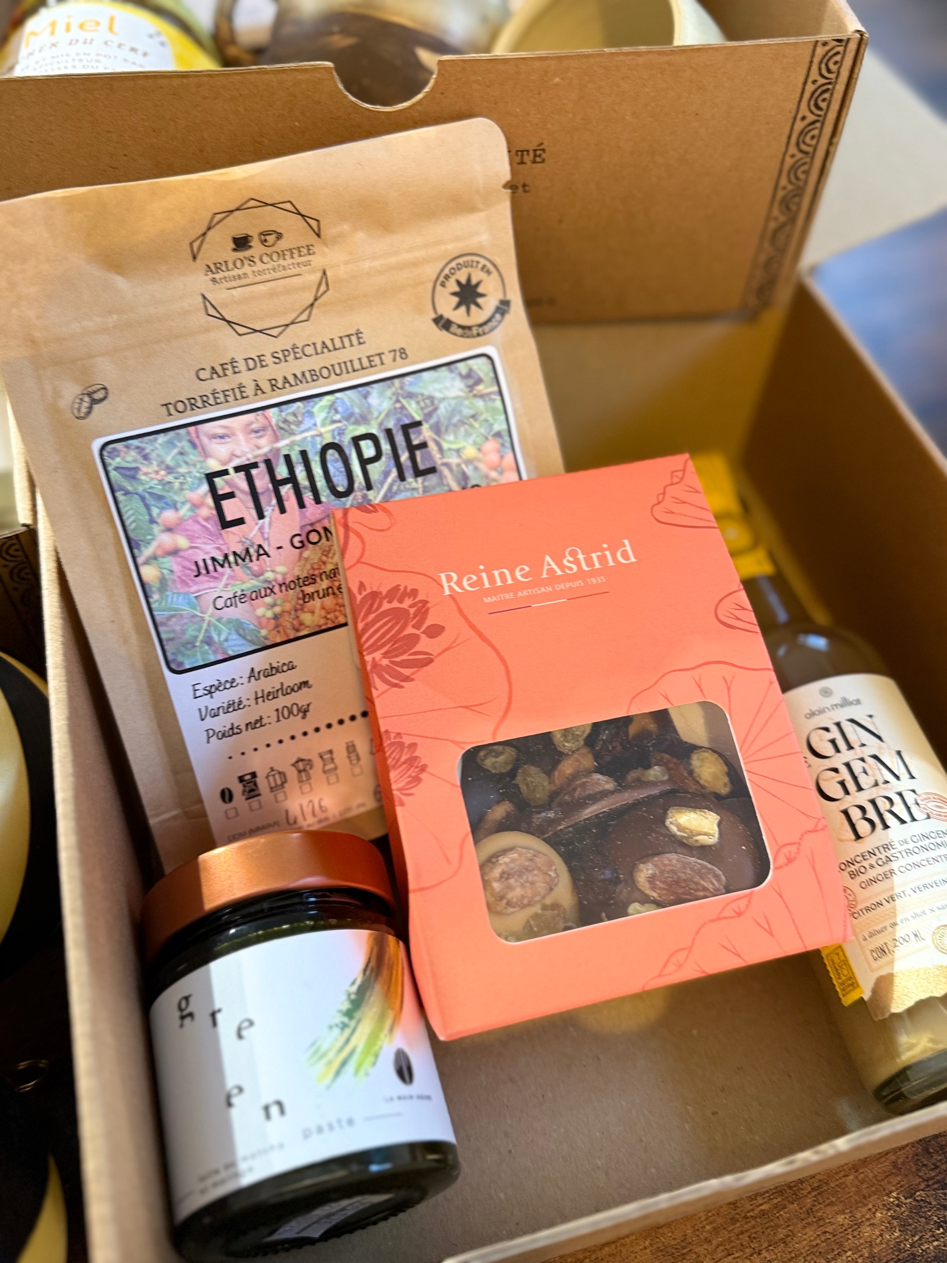 - 2 sachets de café de 250gr, 1 pot de miel de 250gr et une boîte de thé,